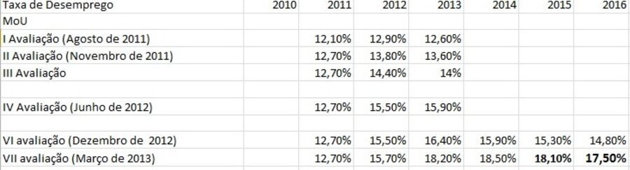 As previsões do desemprego foram acentuadamente revistas pela troika. No documento da sexta avaliação, divulgado pelo FMI em Janeiro, previa-se uma taxa de desemprego de 16,4% em 2013, quando agora se aponta para 18,2%. Antecipava-se ainda que o desemprego começasse a diminuir já em 2014 para uma taxa de 15,9% e neste momento prevê-se que continue a subir e chegue aos 18,5%.