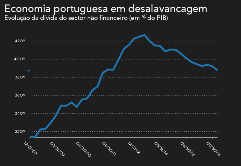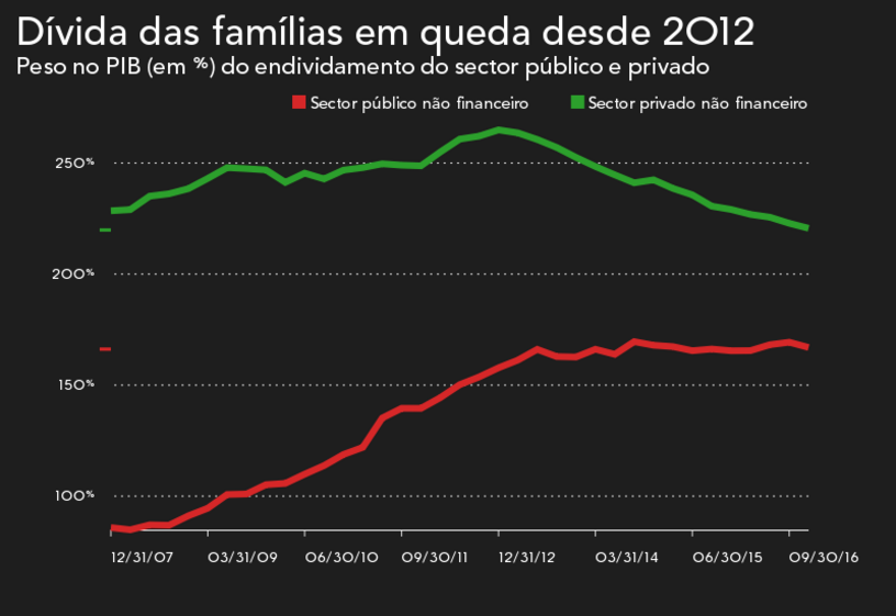 O esforço da descida do endividamento do sector privado é partilhado pelas famílias e empresas, já que ambas conseguiram reduzir a sua alavancagem, contribuindo para mitigar um dos principais problemas da economia portuguesa, identificado mesmo antes da chegada da troika. Face ao pico de 265% do PIB fixado no final de 2012, a redução do endividamento das famílias e empresas supera os 40 pontos percentuais no espaço de quatro anos.