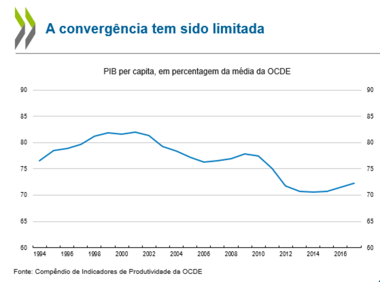 Contudo, a Organização alerta que a convergência com a média dos países que fazem parte da OCDE tem sido "limitada". Como mostra o gráfico da OCDE, o PIB per capita - indicador utilizado para, em parte, atestar o bem-estar económico - de Portugal não chega a representar 75% da média. Apesar da recuperação desde a crise, ainda não se recuperou os níveis anteriores.