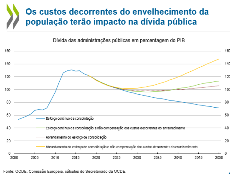 Num exercício teórico, a OCDE antecipa que, se Portugal abrandar o esforço de consolidação e não compensar os custos decorrentes do envelhecimento, a dívida pública poderá ser superior a 140% em 2050. O rácio só baixa no cenário em que continua o esforço de consolidação e são compensados os custos decorrentes do envelhecimento, atingindo um valor inferior a 80% em 2050.