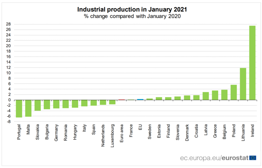 A produção industrial caiu 6,5% em janeiro deste ano, comparando com o mesmo mês do ano anterior, o que equivale à maior queda neste indicador entre os países da União Europeia. Média da região é positiva.