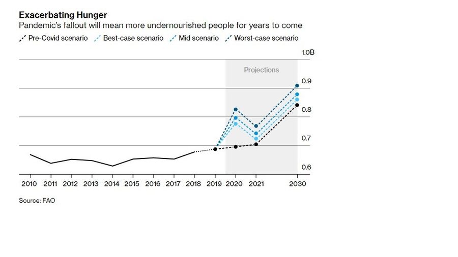 Os efeitos serão duradouros. Na melhor das hipóteses, a ONU prevê que a fome será maior ao longo da próxima década do que o previsto antes da pandemia. Em 2030, o número de subnutridos pode chegar a 909 milhões, em comparação com um cenário pré-covid de 841 milhões.