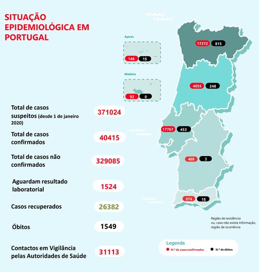 O número de infetados (casos confirmados) aumentou 0,78% para 40.415, o que representa 311 novos casos em 24 horas. Ontem tinha sido anunciado um aumento de 0,92% para 40.104.