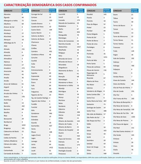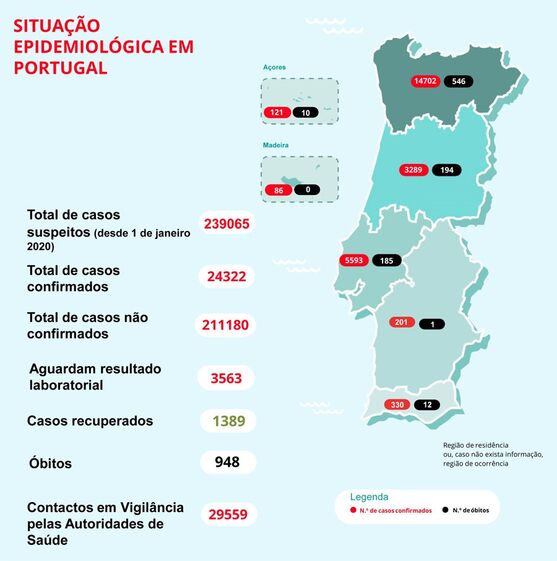 A região Norte (14.702) continua a ser a região que regista o maior número de casos confirmados, com mais de metade do total. Segue-se Lisboa e Vale do Tejo (5.593), região Centro (3.289) e Algarve (330). Há 121 casos nos Açores, 86 na Madeira e 201 no Alentejo.