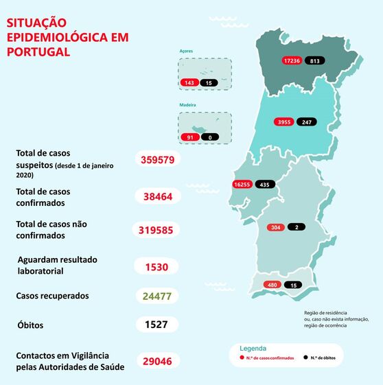 Segundo o boletim diário da DGS, há 813 mortos no Norte (mais de metade do total), 435 na região de Lisboa e Vale do Tejo, 247 no Centro e 15 no Algarve. Os Açores registam 15 óbitos, o Alentejo tem 2 óbitos e a Madeira continua sem vítimas mortais a lamentar.