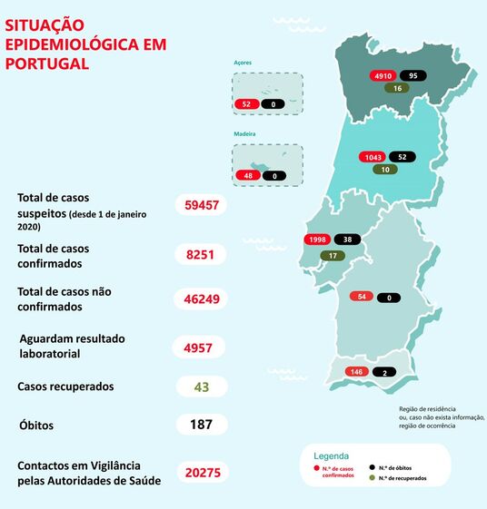 A região Norte (4.910) continua a ser a região que regista o maior número de casos confirmados, com mais de metade do total. Segue-se Lisboa e Vale do Tejo (1.998), região Centro (1.043) e Algarve (146). Há 52 casos nos Açores, 48 na Madeira e 54 no Alentejo.