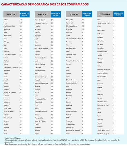 Em baixo estão os casos por concelho. A DGS assinala que nestes dados por concelho a informação reportada é relativa a 79% dos casos confirmados.