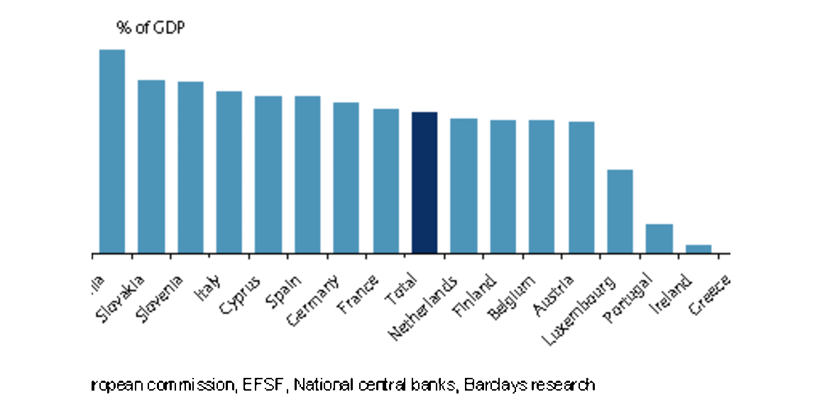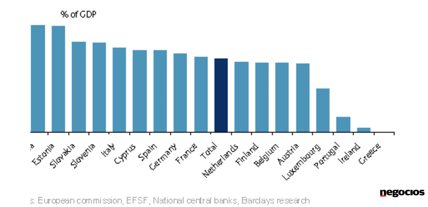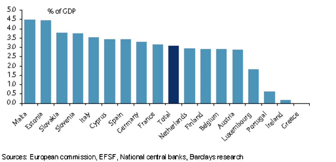 Se a Grécia sair do euro e não pagar rigorosamente nada do que deve aos restantes Estados parceiros, estes terão de acomodar perdas de 290 mil milhões de euros, o que representa 3% do seu PIB conjunto. Alemanha é quem mais perde em termos absolutos. Mas a factura mais pesada recairá sobre Malta, Estónia e Eslováquia, calcula o Barclays.