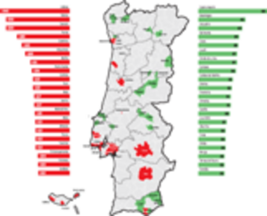 A vermelho estão assinaladas as câmaras que não fizeram desconto no IRS. A verde as que vão devolver IRS aos moradores. Os valores, médios, estão assinalados em euros.