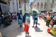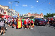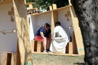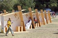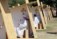 Já em círculo, "em direção, ao lado externo, as efígies dos 13 padroeiros" da JMJ, todos santos ou beatos, que dedicaram as suas vidas ao serviço dos jovens".