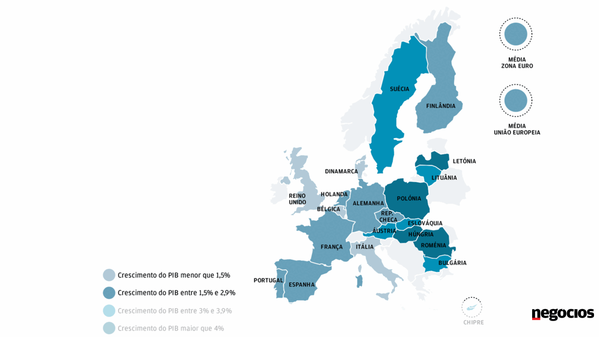 Nos restantes Estados-membros a economia cresceu de forma semelhante - no caso da Suécia e da Polónia - ou cresceu menos. As principais quedas foram as da República Checa de 4,2% para 2,3%, de França de 2,2% para 1,7% e da Holanda de 3% para 2,7%. Em termos agregados, aconteceu o mesmo: o PIB da Zona Euro desacelerou de 2,5% para 2,2% e o da União Europeia de 2,4% para 2,2%.