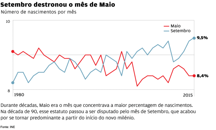 Segundo os dados facultados pelo INE ao Negócios, ao longo da década de 80, Maio era invariavelmente o mês em que nasciam mais crianças. Só a partir dos anos 90 é que a sua liderança começou a ser disputada, precisamente por Setembro, que se tornou rei e senhor a partir de 2002. Nos últimos cinco anos, Maio surge em quinto lugar, ultrapassado por Julho, Agosto e Outubro, além de Setembro.