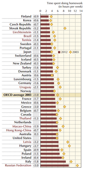 Ao longo da última década, a generalidade dos países desenvolvidos reduziu a carga horária exigida pelos TPC. Ainda assim, Espanha é dos países onde "cumprir os deveres" exige mais horas, mais de seis por semana. Já a Finlândia, cujos resultados de aprendizagem lideram frequentemente os ranking mundiais, é o país onde os TPC consomem menos tempo, segundo o mais recente levantamento da OCDE (ver tabela).