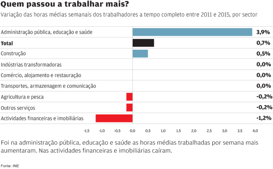 Os dados solicitados ao Instituto Nacional de Estatística (INE) relativos à duração semanal habitual de trabalho mostram que, sem surpresas, o sector que inclui a administração pública, a saúde e a educação foi o que registou o maior aumento entre 2011 e 2015, com um crescimento de 3,9% nas horas de trabalho.