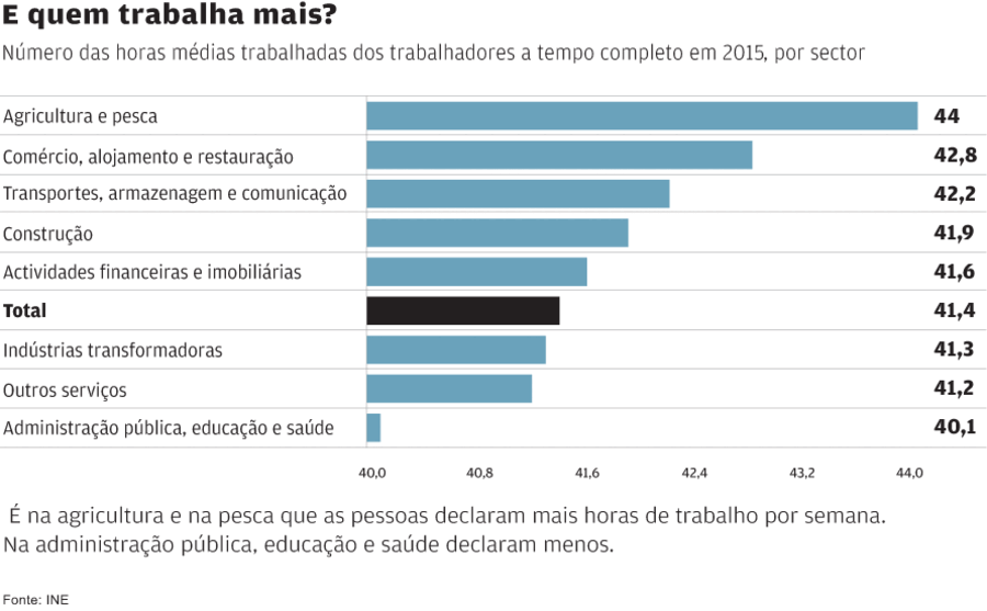 Como fica o panorama depois desta evolução? A semana de trabalho parece ser claramente mais longa na agricultura e pesca, onde as pessoas declaram, em média, trabalhar 44 horas. A categoria que agrega o comércio, a restauração e o alojamento também se destaca, com 42,8 horas por semana.