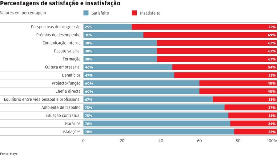 Três quartos (75%) dos trabalhadores inquiridos pela Hays, uma empresa de recrutamento, mostram-se insatisfeitos com as suas perspectivas de progressão. Os prémios de desempenho, a comunicação interna, e o pacote salarial são factores que também não contribuem para a motivação, com mais de 60% dos trabalhadores a revelarem-se "insatisfeitos" com estas dimensões do trabalho.