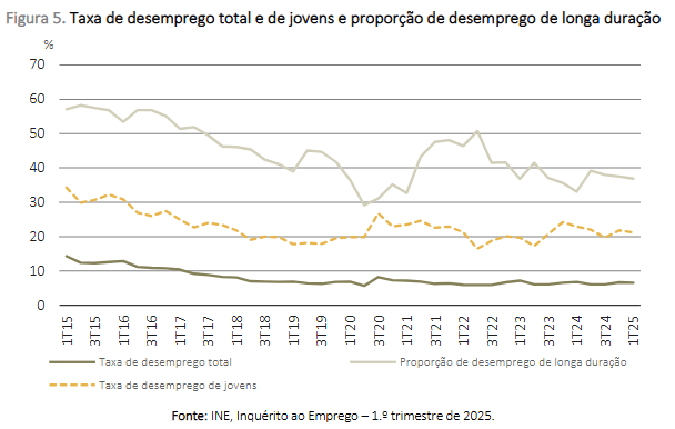 Assim, "a taxa de desemprego foi estimada em 6,6%, valor inferior em 0,1 pontos percentuais ao do trimestre anterior e inferior em 0,2 pontos percentuais ao do 1.º trimestre de 2024", diz o INE.