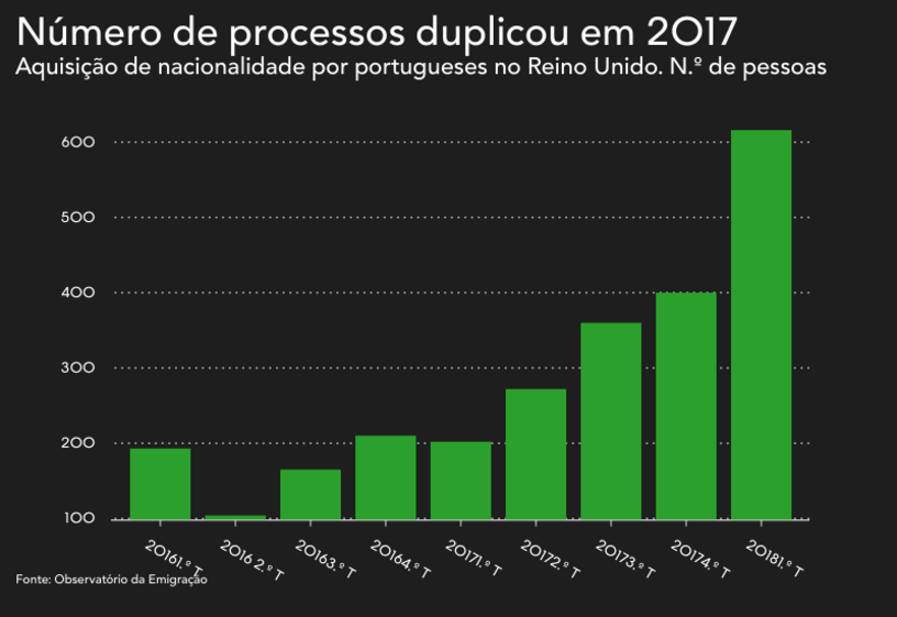Segundo os dados oficiais do governo britânico, compilados pelo Observatório da Emigração, logo no ano seguinte à votação, o número de portugueses que obteve a nacionalidade britânica quase duplicou de 672 para 1.234 na contagem final de 2017, em que os serviços registaram um total de 123.115 estrangeiros a conseguir a nacionalidade.