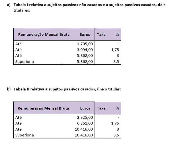 As taxas, consoante o escalão de rendimento, aplicam-se sobre a diferença entre o rendimento bruto, os descontos para a Segurança Social, a retenção na fonte de IRS e o salário mínimo nacional (557 euros).