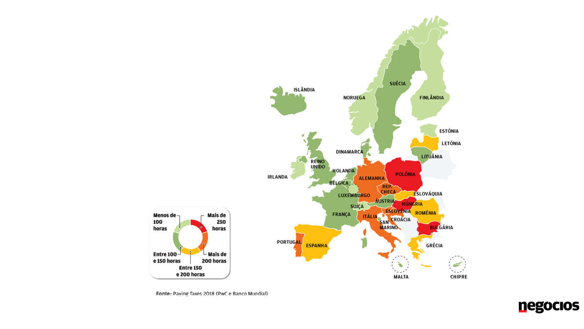 Veja no mapa quanto tempo é exigido em 33 países europeus para cumprir as principais obrigações fiscais. Portugal é dos países onde se gasta mais tempo.