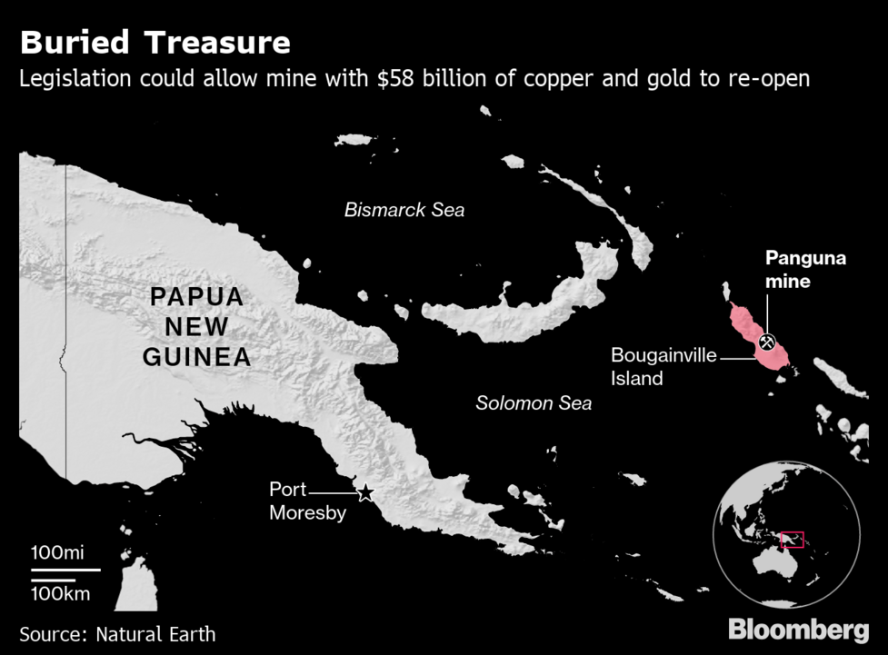 As mudanças na lei de mineração coincidem com os preparativos para um referendo sobre a independência de Bougainville, que será realizado este ano e poderá forçar a região a procurar novas fontes de receita para substituir os atuais subsídios da Papua Nova Guiné. Estima-se que a mina de Panguna tenha 5,3 milhões de toneladas de cobre e 19,3 milhões de onças de ouro, de acordo com a BCL, que valem cerca de 58 mil milhões de dólares aos preços atuais, segundo cálculos da Bloomberg.