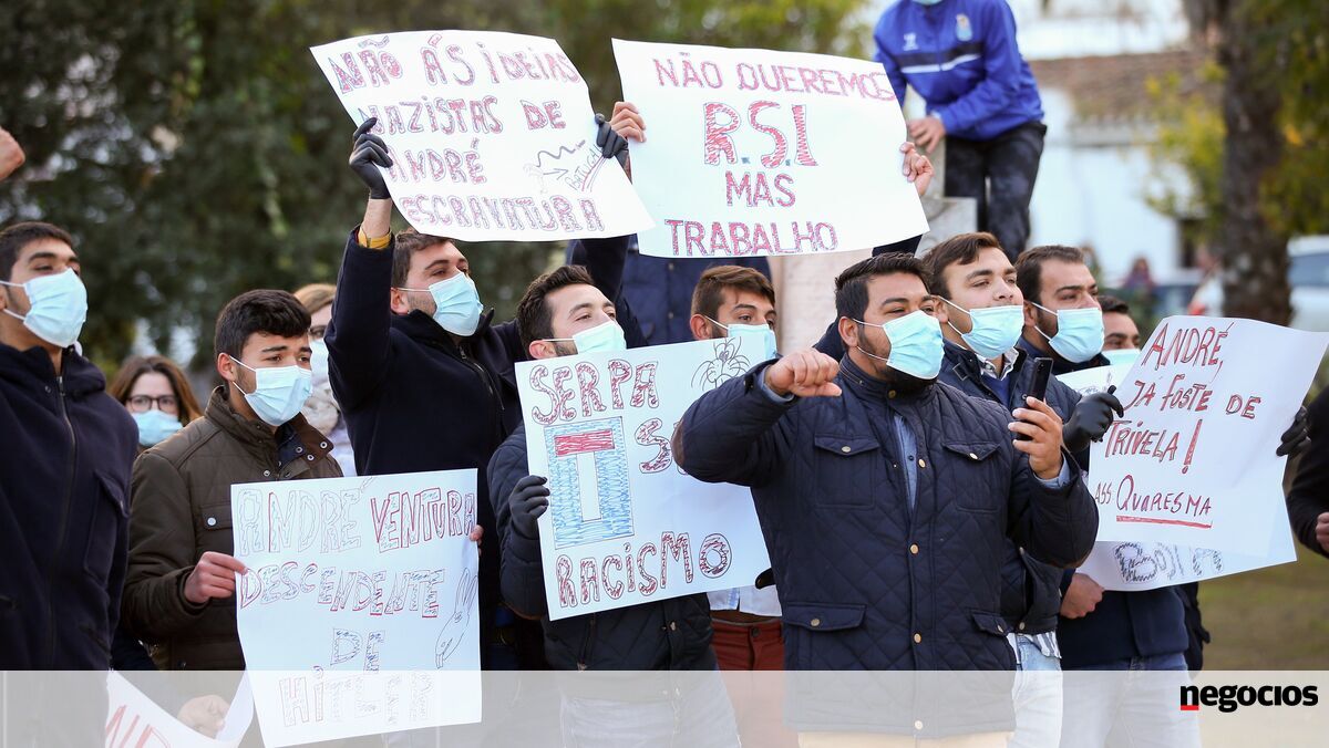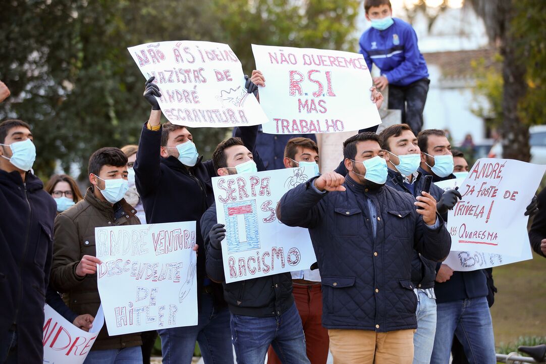 "Vão trabalhar, trabalhar!", limitou-se a gritar André Ventura, em direção aos manifestantes, a maioria de etnia cigana e com cartazes antifascistas, ladeado por seguranças e com meia-hora de atraso face ao previsto.