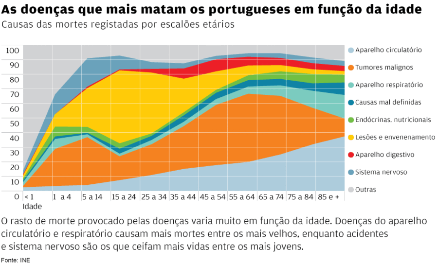 Os números do Instituto Nacional de Estatística (INE) mostram que a percentagem de mortes relacionadas com o aparelho circulatório sobe de forma vertiginosa com a idade. Entre os jovens de 25 e 34 anos, só 11% morrem por esta razão, percentagem que sobe para 37% quando a morte ocorre depois dos 85 anos.
