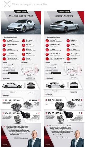 Em combinação com o Pacote Sport Chrono, oferecido de série, e alimentado por um motor V8 biturbo de quatro litros de capacidade que disponibiliza agora 571 cv ao invés de 550 cv, o novo Panamera Turbo S E-Hybrid completa agora a aceleração dos zero aos 100 km/h em 3,2 segundos – 0,2 mais veloz do que o seu antecessor. Alcança uma velocidade máxima de 315 km/h, o que representa um incremento de 5 km/h.