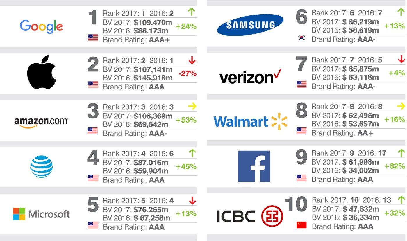 Neste ranking não surge nenhuma companhia europeia, sendo asiáticas as duas empresas que se intrometem entre as multinacionais americanas. A sul-coreana Samsung e o chinês ICBC aparecem, respectivamente, como a sexta e décima marcas mais valiosas do mundo.