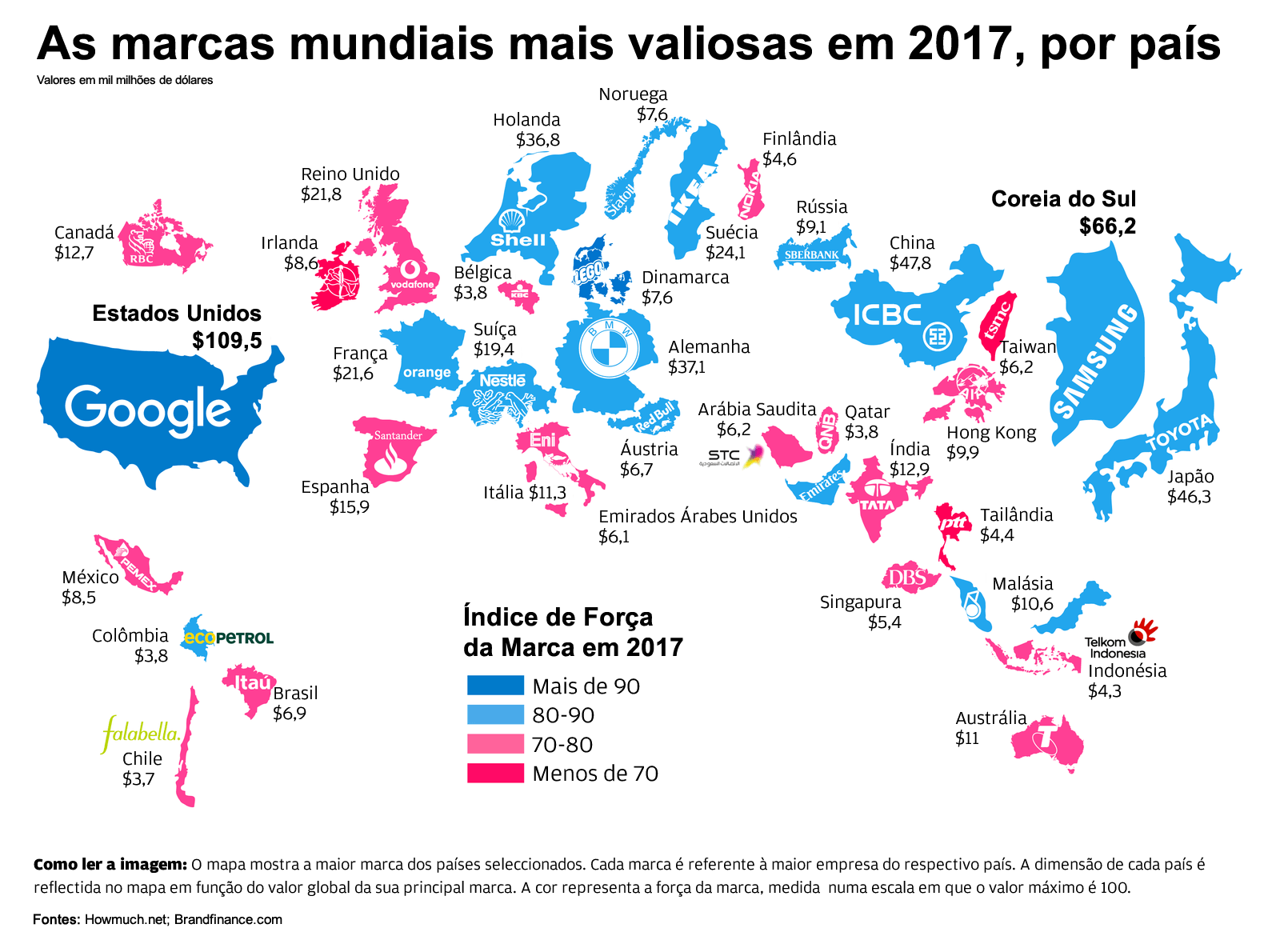 Seguem-se duas fabricantes automóveis, a japonesa Toyota (46,3 mil milhões de dólares) e a alemã BMW (37,1 mil milhões de dólares). Neste mapa verifica-se ainda que as marcas mais valiosas da generalidade dos países escolhidos apresentam valores abaixo dos 25 mil milhões de dólares. Consulte o mapa em tamanho real.
