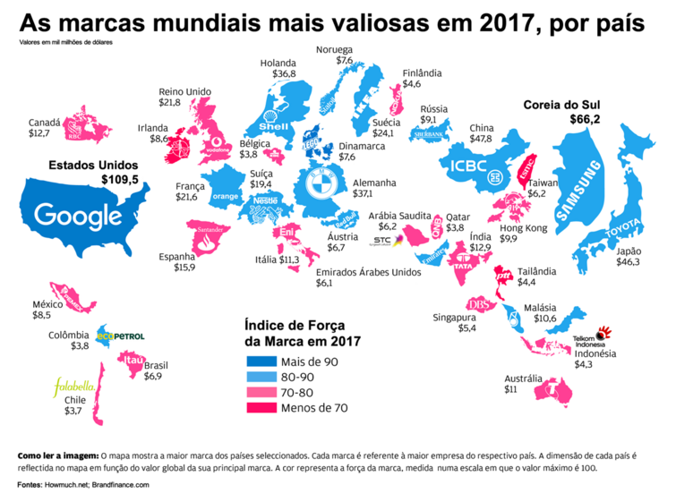 Com base num ranking elaborado pela Brand Finance, o site HowMuch.net construiu um mapa em que identifica as marcas mais valiosas do mundo por país. Os Estados Unidos continuam a dominar com oito das 10 marcas mundiais mais valiosas.