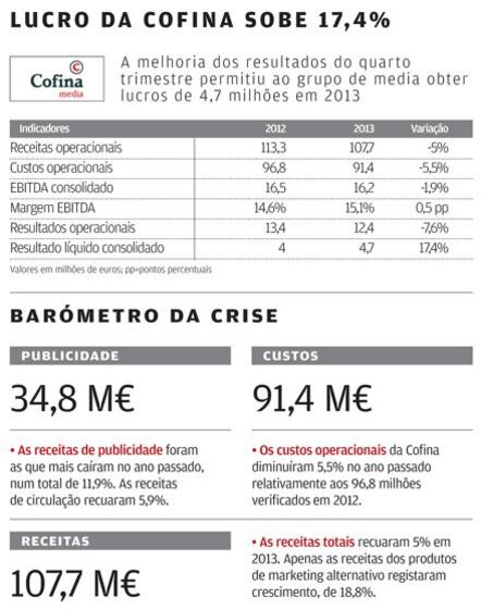 “O quarto trimestre de 2013 foi caracterizado por um crescimento das receitas, motivado, essencialmente, pelo desempenho do marketing alternativo”, sublinha ainda a Cofina, assinalando que, “apesar do aumento das amortizações (resultantes da entrada em funcionamento da CM TV) e dos resultados financeiros”, o resultado líquido consolidado registado nesses três meses cresceu mais de 77%, atingindo os 3,1 milhões de euros.