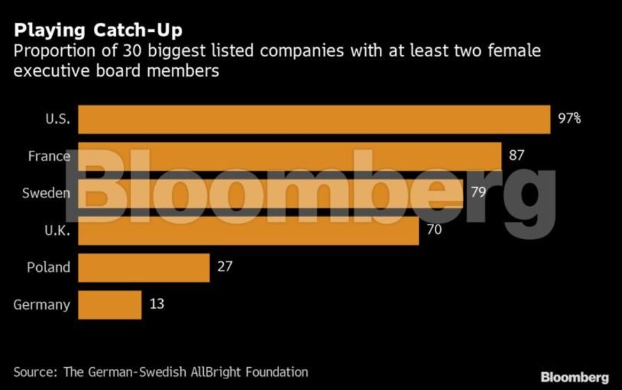 A proporção de mulheres em conselhos executivos nas 30 maiores empresas cotadas da Alemanha caiu 1,9 pontos percentuais neste ano para 12,8%, em comparação com 28,6% nos EUA, segundo a Allbright Foundation, que promove a diversidade na gestão. Cerca de um terço das 100 maiores empresas da Alemanha não tem mulheres nos seus conselhos de administração.