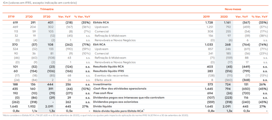 O CFO salienta que no negócio de "upstream" (produção de petróleo) os resultados foram penalizados pelo baixo valor do Brent e desvalorização do dólar, enquanto na unidade comercial a atividade foi penalizada pelo menor volume de vendas devido à redução da procura num contexto de pandemia. Já na refinação os resultados foram castigados pela margem negativa no terceiro trimestre, o que levou mesmo a empresa a suspender a produção de combustíveis em Matosinhos.