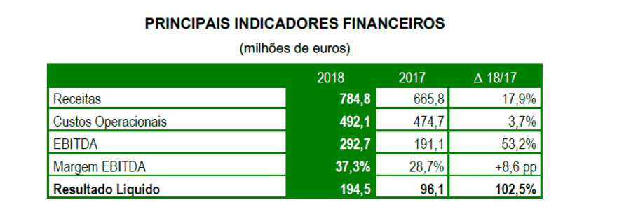 O EBITDA atingiu 292,7 milhões de euros, mais cerca de 53% face a 2017, enquanto a margem atingiu os 37,3%, mais 8,6 pontos percentuais.