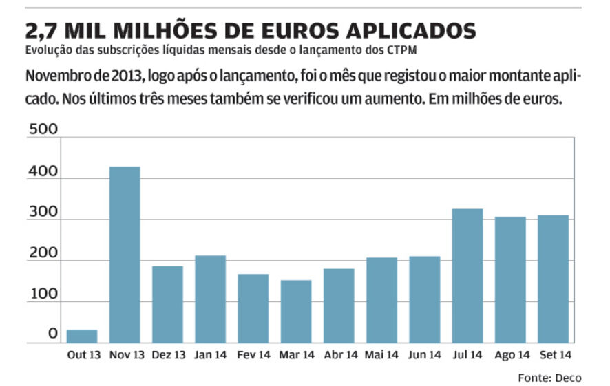 Este produto foi lançado num período de diminuição das taxas de juro, o que o tornou um sucesso, já que apresenta taxas de juro superiores à maior parte dos produtos de capital garantido, nomeadamente os depósitos a prazo. Segundo os dados apresentados no último Boletim Mensal do IGCP, desde o lançamento, o montante aplicado em Certificados do Tesouro Poupança Mais ultrapassou já os 2,7 mil milhões de euros. O primeiro mês após o lançamento foi o que registou maior volume de aplicações (428 milhões de euros). Desde julho deste ano, os montantes mensais têm ultrapassado sempre os 300 milhões, como se pode ver no gráfico. Os montantes resgatados são relativamente baixos.