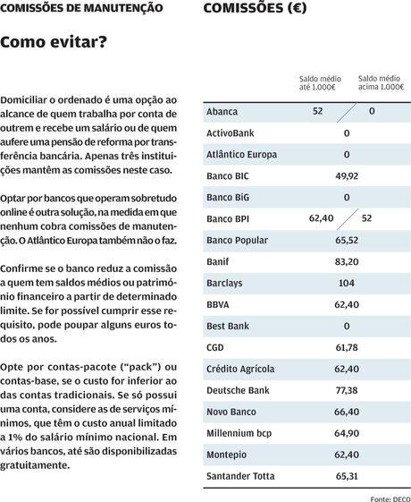 O fenómeno repete-se, em maior ou menor escala, nos outros bancos. Tal como advertimos por diversas vezes, um dos principais agravamentos ocorre mesmo nas comissões de manutenção aplicadas aos clientes com contas à ordem. De entre os bancos que os praticam, e para um saldo médio até 1.000 euros, estes encargos variam entre os 49,92 euros anuais do Banco BIC e os 104 euros do Barclays, cujo negócio em Portugal passará, a partir de abril, a ser detido pelo Bankinter. Em alguns casos, as despesas de manutenção são agravadas em contas com saldos médios inferiores a 1.000 euros, penalizando claramente quem tem menos recursos.
