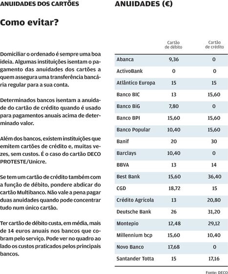 Os bancos agravaram, na última década, as anuidades dos cartões de débito. Só a Caixa Geral de Depósitos, que tem a maior quota de clientes, cobra atualmente 18,72 euros por esta anuidade, a segunda mais cara. Apenas o ActivoBank não cobra a comissão. Nos bancos que o fazem, custa, em média, 14,63 euros por ano. Tendo em conta que o cartão de débito já se tornou num produto essencial no dia a dia dos consumidores e que a sua utilização gera enormes ganhos para os bancos, as anuidades devem ser sujeitas a um limite.