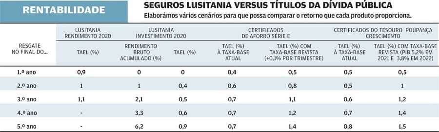A Lusitania Vida tem dois seguros, que já analisámos na Proteste Investe no início do ano e sugerimos como opção de investimento para os prazos de três e cinco anos. Trata-se do Lusitania Rendimento 2020 e Lusitania Investimento 2020, também comercializados pelo Abanca. São as únicas opções no mercado de seguros de capitalização de taxa fixa. Quando comparados com outras alternativas do mercado, como Certificados de Aforro ou do Tesouro, são uma opção interessante. O Lusitania Rendimento 2020 tem uma duração mínima de três anos e rende 1,1% líquidos ao ano, se mantiver durante este prazo. A subscrição é feita através de uma entrega única, com o mínimo de 500 euros e múltiplos de 100 euros. Não são permitidos reforços posteriores. O capital investido é aplicado num fundo composto por mais de 80% por títulos de rendimento fixo de dívida pública e privada, emitida em estados da OCDE. O rendimento anual é calculado e pago, no fim de cada anuidade, por aplicação da taxa de juro anual respetiva ao capital seguro. A partir do final do quarto mês é permitido efetuar o resgate total. O Lusitania Investimento 2020 rende 0,9% líquidos ao ano, se mantiver durante os cinco anos e um dia. A subscrição é feita através de uma entrega única, com o mínimo de 1.000 euros e múltiplos de 100 euros. Se mantiver até final do prazo, acumula um rendimento bruto de 6,2%, o que equivale a uma taxa anual efetiva líquida de 0,9 por cento. Pode efetuar o resgate total a partir do final do 6.º mês, recebendo o capital investido acrescido de um rendimento. Comparámos estes dois seguros da Lusitania com os títulos da dívida pública. Se tivermos em conta apenas os cenários-base que elaborámos (no quadro em baixo), sem subida do PIB ou da Euribor, os seguros rendem mais a médio prazo do que os títulos de dívida do Estado. São, por isso, duas boas opções de investimento, caso pretenda garantia de capital. Têm a desvantagem de não permitirem entregas posteriores, não sendo, por isso, produtos de poupança regular. Além disso, não estão ao abrigo do Fundo de Garantia de depósitos. Mas as seguradoras têm reservas que garantem o capital.