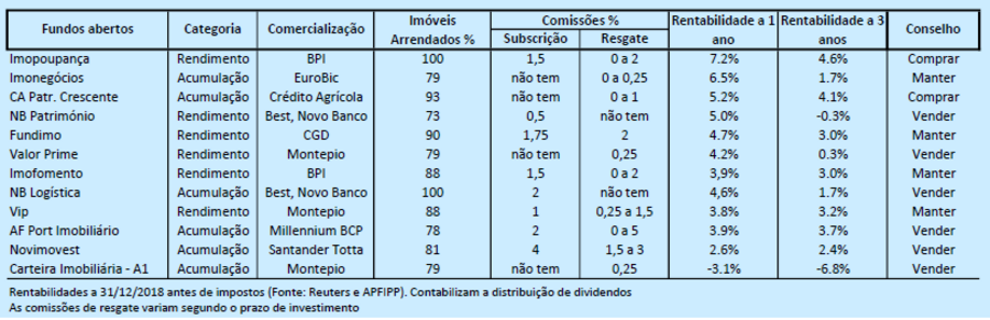Se, no último ano, seguiu o nosso conselho de manter em carteira os fundos CA Património Crescente e Imopoupança fez bem. Este apresentou, em dezembro, a melhor rentabilidade do ano (7,2%). Quanto ao fundo comercializado pelo Crédito Agrícola, valorizou 5,2% por cento. Face à sólida evolução dos resultados obtidos por estes dois ativos, a nossa recomendação é agora de comprar. O desempenho do Imonegócios e do Imofomento levam-nos também a alterar o conselho de "vender" para "manter". Face à nossa análise, e tendo em conta os custos de subscrição e de resgate, o investimento no Imopoupança deve ser, no mínimo, de 5 anos, e no CA Património Crescente mais de 3 anos. As comissões são mais estáveis ao longo do tempo e os investidores têm uma melhor perceção do impacto dos custos na rentabilidade final. Por exemplo, o CA Património Crescente, que tem uma política de investimento bastante diversificada (comércio, habitação, serviços, indústria, logística, turismo, etc.), permite um resgate sem custos a partir do terceiro ano.