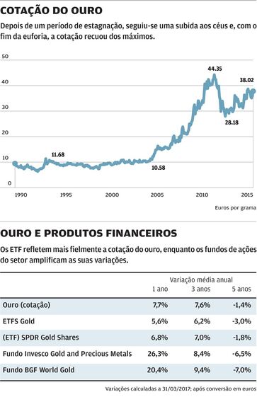Antes, um pouco de história. Durante a década de 1990 e até 2005, o preço do ouro quase não alterou. Depois, beneficiou da febre dos produtos financeiros e das matérias-primas e disparou para quase 2000 dólares. Em seguida, muito investidores abandonaram- no porque, em pouco tempo, caiu para perto de 1200 dólares. A crença de que a subida era o único caminho foi drasticamente abalada. Desde então, a cotação recuperou um pouco, mas o recuo chegou a ser de 44 euros por grama para pouco mais de 28 euros (ver figura). Estas flutuações evidenciam o risco do ouro. Por um lado, o metal dourado está "cotado" à semelhança dos ativos financeiros e o seu valor oscila. Por outro, não paga dividendos nem juros e a sua avaliação está sujeita a mais fatores subjetivos. De facto, parte da sua negociação destina-se a fins industriais, mas muitas transações navegam ao sabor do sentimento dos investidores.