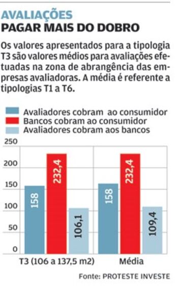 Em 2011 verificámos que as empresas avaliadoras cobravam aos bancos duas vezes menos do que aos consumidores. Hoje, a situação mantém-se: em média os bancos cobram 232 euros aos consumidores, enquanto as empresas avaliadoras pedem 109 euros aos bancos. Estamos a falar de uma margem de mais de 100% amealhada pelos bancos. Quando contratadas diretamente pelos consumidores, as avaliadoras cobram pela avaliação de uma habitação 163 euros em média.