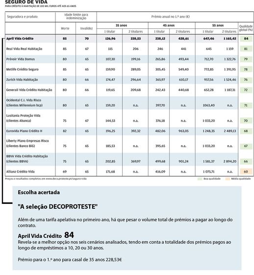 A sua vida não tem preço, é verdade. Mas, para o banco e para seguradora, tem. A DECOPROTESTE recolheu as tarifas para morte e invalidez permanente das seguradoras que participaram no estudo e traçou cenários para clientes em diferentes fases da vida, mas que precisassem sempre de um seguro de vida para um crédito à habitação de 100 mil euros.