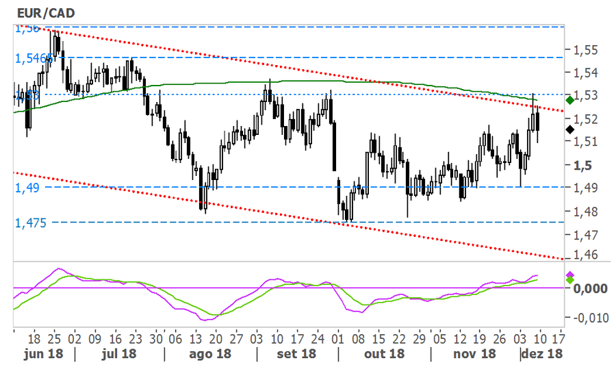 O Eur/Cad acabou por recuar para máximos de finais de setembro, após o Banco do Canadá ter mantido as taxas de juro como previsto, tendo, contudo, dado a entender que o ritmo de subidas será mais gradual, levando a um corte nas expectativas de subida no próximo mês e pressionando o dólar canadiano para mínimos de dez semanas face ao euro. O Bank of Canada reiterou que é necessário um aperto monetário para atingir os 2% de inflação, mas argumentou que as revisões em baixa do Statistics Canada em relação aos valores de crescimento, juntamente com os recentes desenvolvimentos macroeconómicos poderão indicar uma menor pressão inflacionista. No Canadá a taxa de desemprego recuou para os 5.6%, o valor mais baixo desde 1976, quando se esperava que esta se mantivesse inalterada nos 5.8%, tendo sido contratadas 94.100 pessoas em novembro, tendo dado algum impulso à moeda do país que recuperou ligeiramente dos mínimos atingidos no dia anterior.