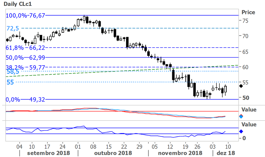 Tecnicamente, o crude encontrou suporte na zona dos $49.30 e acabou por ressaltar e atingir os 55$. Até momento o crude adotou uma perspetiva de consolidação entre $51-$54 à medida que vai libertando alguma pressão bearish, devido às quedas registadas nos últimos dois meses. O MACD iniciou um sinal de compra o que poderá levar o crude a testar novamente os $55.