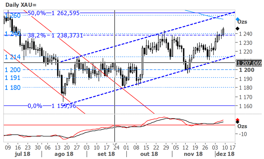 A cotação do ouro atingiu máximos de meados de julho nos $1246, beneficiando da queda do dólar face às principais divisas, após os dados do relatório de emprego de novembro terem ficado aquém do esperado pelo mercado. Desta forma, os investidores vêm agora mais hipóteses de a Fed abrandar o ritmo das subidas de taxas de juros nos EUA.