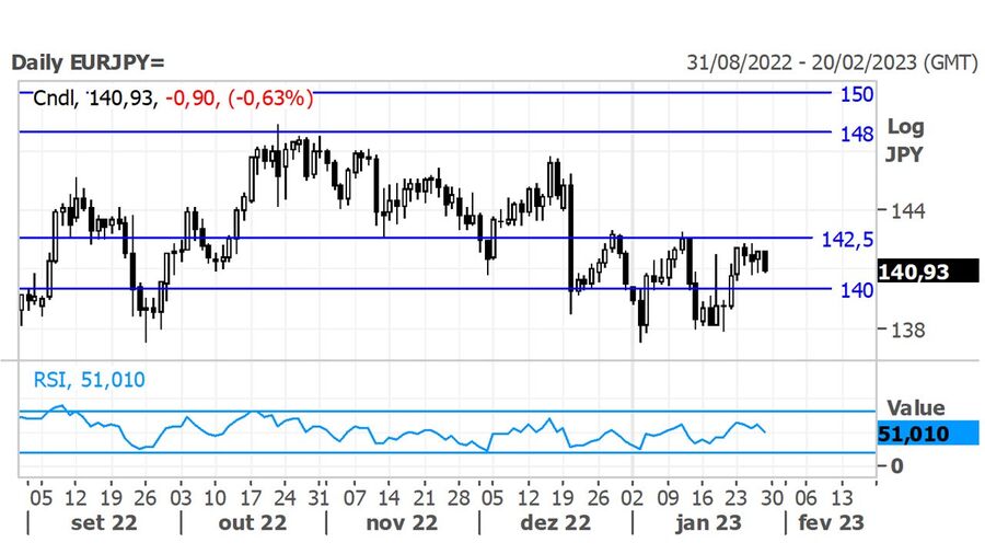 Inflação subjacente do Japão renovou máximo de 41 anos; Eur/Jpy acima de 140 ienes; Economia dos EUA cresceu 2,1% em 2022; Eur/Usd renovou máximos de 9 meses; Petróleo acima dos $80; Ouro recua nos $1950.