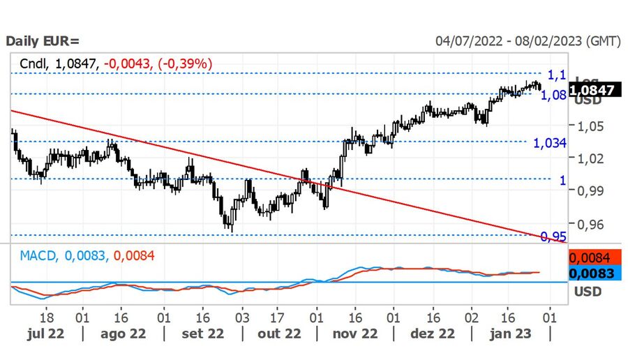 A nível técnico, o Eur/Usd, na última semana, renovou máximos de 9 meses nos $1,0929, após ter quebrado em alta a resistência dos $1,08 , transacionando acima de tal nível. Assim, espera-se que no curto prazo o par continue a valorizar, aproximando-se cada vez mais da possível resistência no nível dos $1,10.