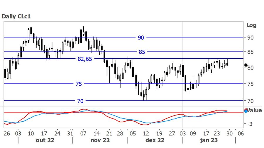 A nível técnico, na última semana, o crude apresentou uma valorização, mas sem quebrar a resistência que parece existir nos $82.65/barril. Acima deste nível, o crude poderia subir para $85 primeiro e $90/barril a seguir.