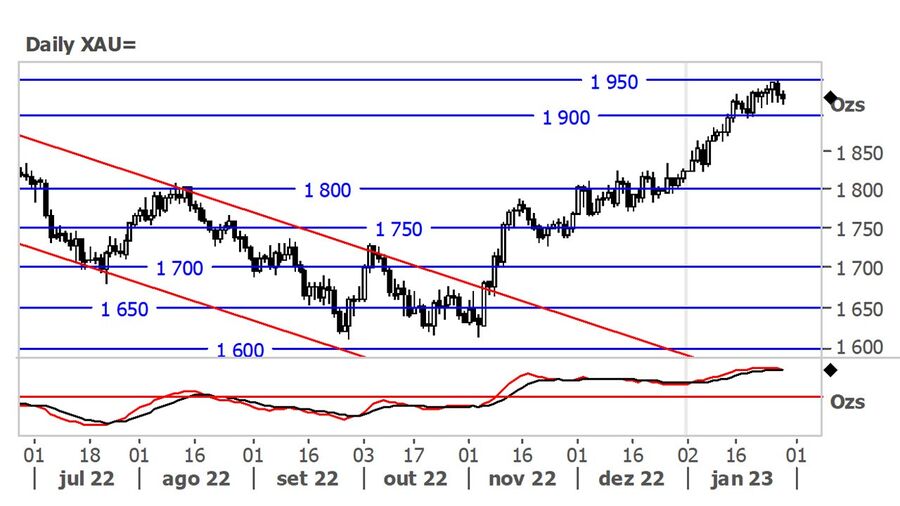 O ouro, expresso em dólares, recuou face ao teste dos $1950. Adicionalmente, os preços do ouro foram afetados pelo faco de os dados do crescimento dos EUA no 4º trimestre terem sido lidos acima do esperado, servindo como apoio para a Fed realizar mais aumentos da sua taxa de juro, influenciando negativamente o preço do metal precioso.